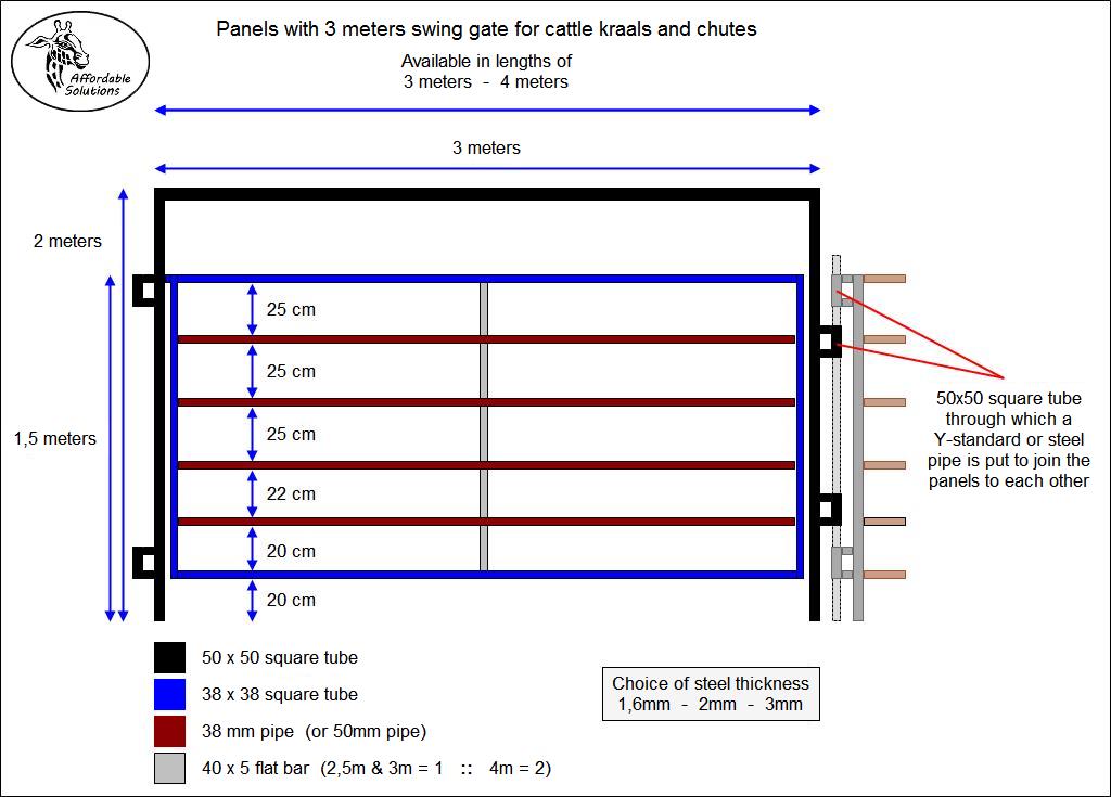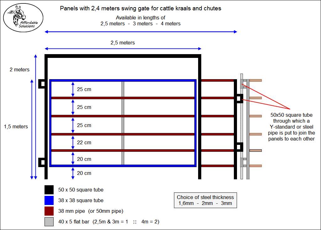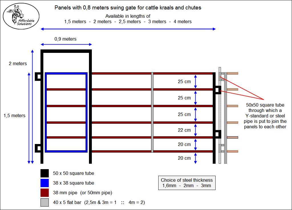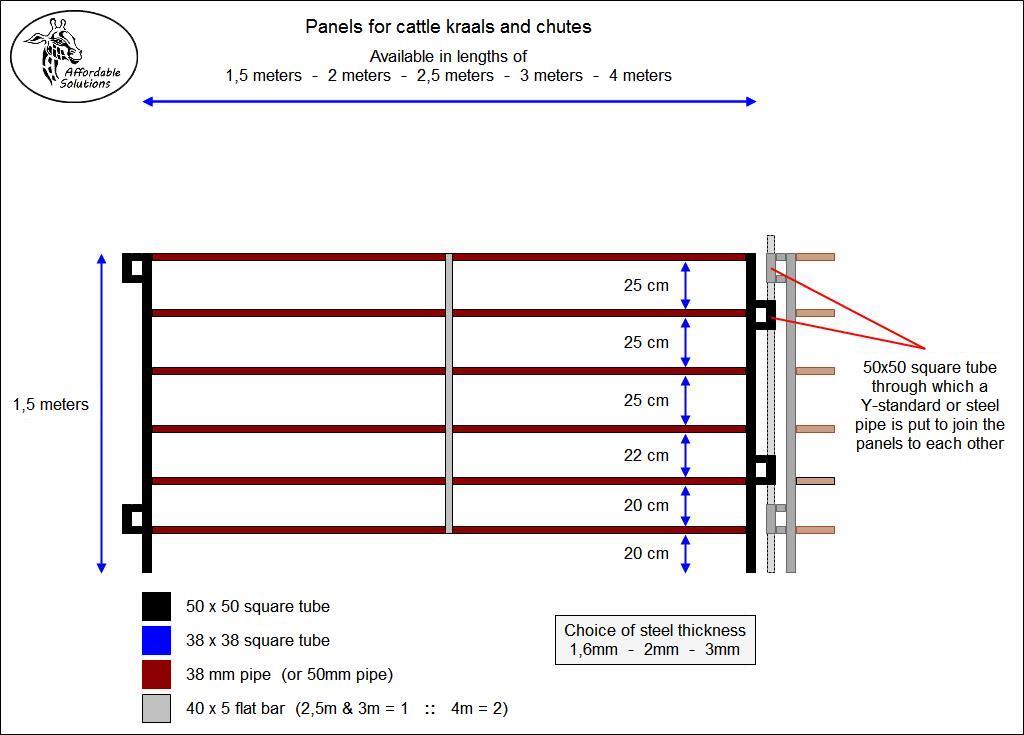 Each farmer's requirements and kraal outlay is different. We offer a standard range of panels, but also build panels to suit the farmer's requirements. Send us a sketch with measurements of the kraal setup that you are planning, and we will build the panels that you will need to build your kraal.