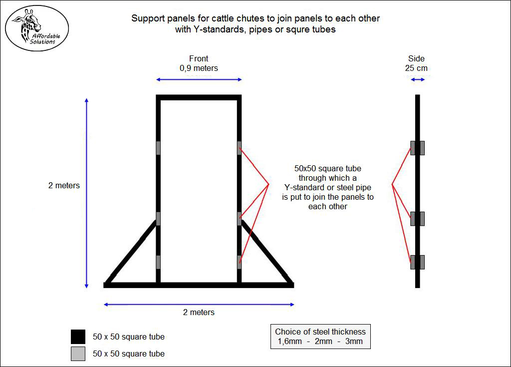 Panels for kraal, chute and gates are build with 50x50 square tube and 38mm pipe. The farmer choose the steel thickness 1,6mm - 2mm - 3mm thick steel.
