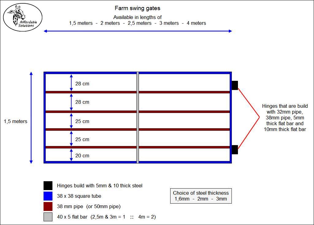 The swing gates that we build are build with 38x38 square tube and 38mm pipe, which is stronger than the 32mm pipe gates that are commonly bought.