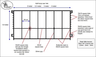 Die vertikale regop staal is 32mm staal pyp met openinge van 40cm tussen pype waardeur die kalwers loop.