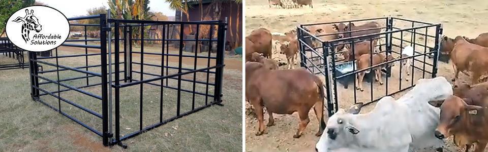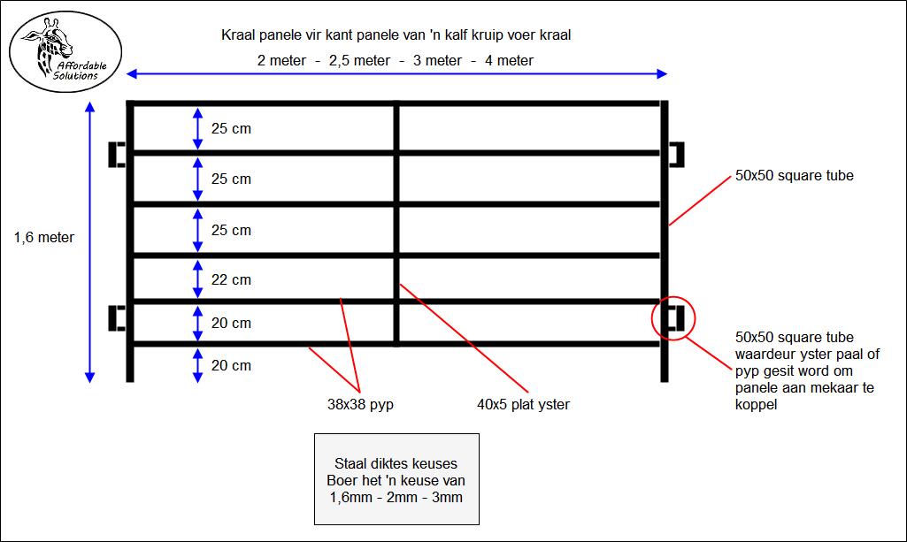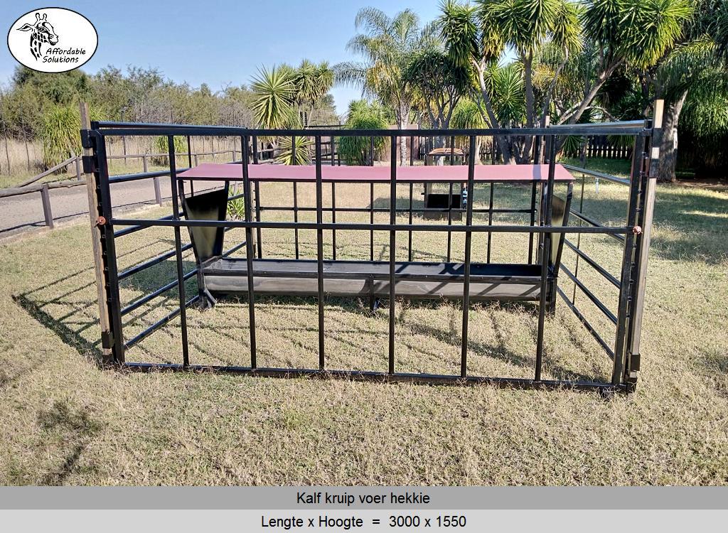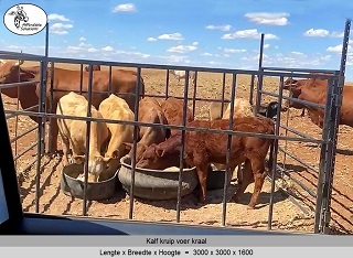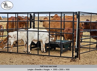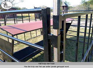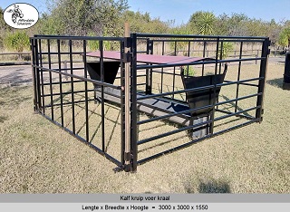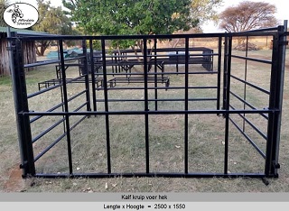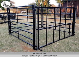 Kalf kruip voer hekke en kraal panele word gebou met square tube en pyp. Die boer het 'n keuse van staal diktes van 1,6mm - 2mm - 3mm dik staal.