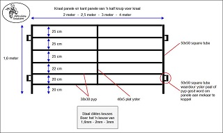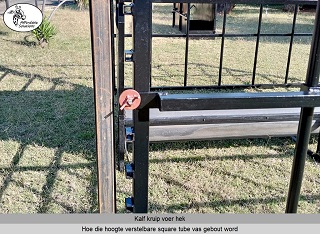 Op beide punte van die kruip hek is twee 50x50 square tubes aan elke hoek vas gesweis. Ons sweis ook 50x50 square tubes aan die kraal panele vir 'n voer kraal. Die boer kan 'n yster paal (y-standard) deur die square tubes sit om die panele aan mekaar te koppel.