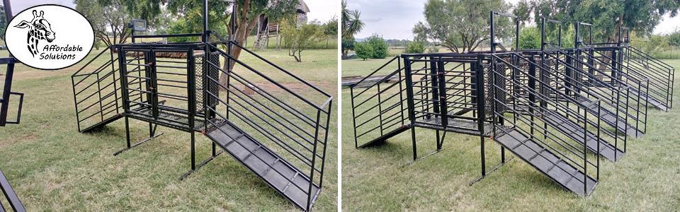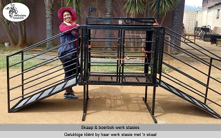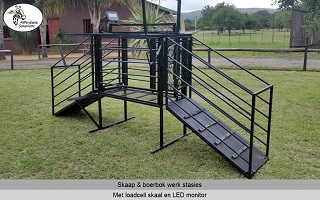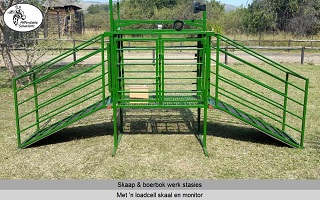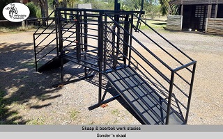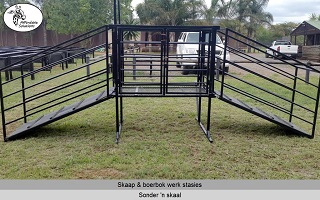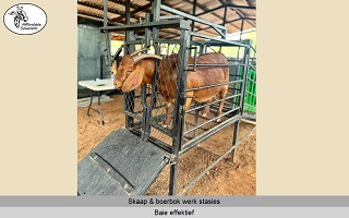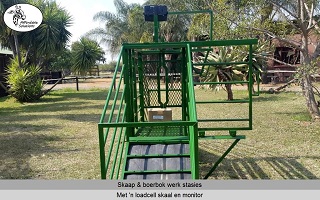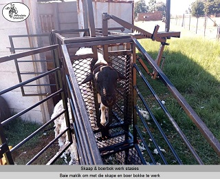 Lengte x Breedte x Hoogte = 1200 x 500 x 1450. Die ingang het 'n gly hek om vinnig en maklik oop en toe te maak. Die nek klamp hou die skaap of boerbok veilig in posisie om vinnig te kan werk. Die vloer van die werk stasie word gebou met 'n staal raam en 3mm dik expanded metal. Swaai hekke aan beide kante, sodat twee mense gelyktydig kan werk. Een kant het 'n groot swaai hek wat die volle lengte van die werk stasie is. Die ander kant het twee swaai hekke.