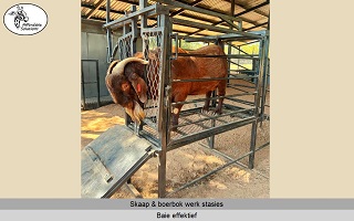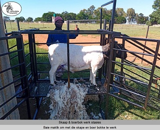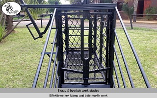 Die nek klamp hou die skaap of boerbok veilig in posisie om vinnig te kan werk.