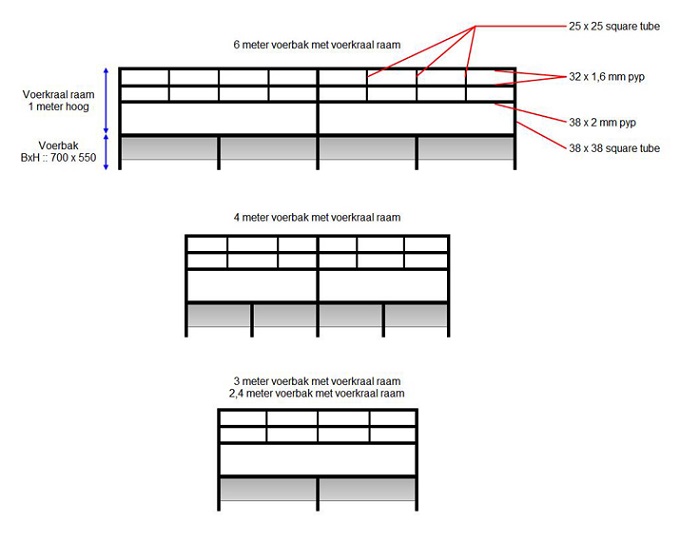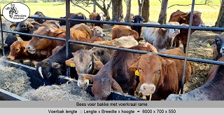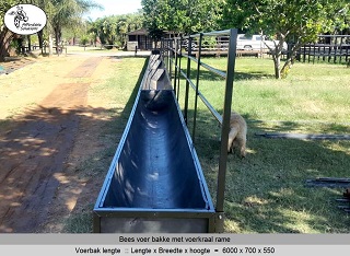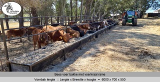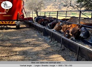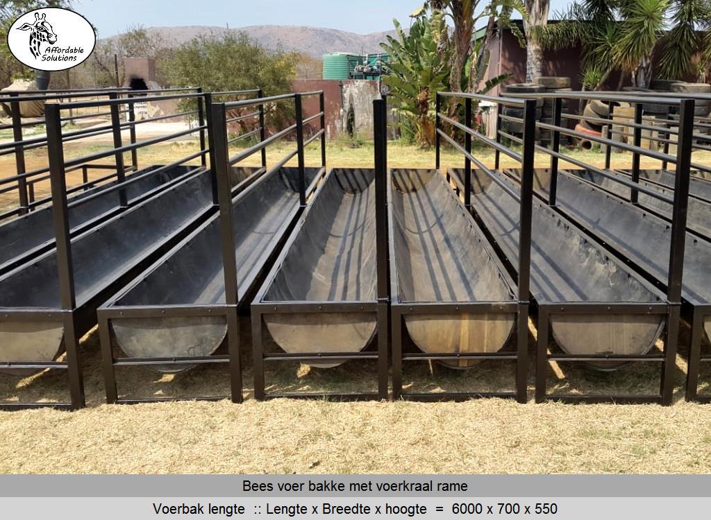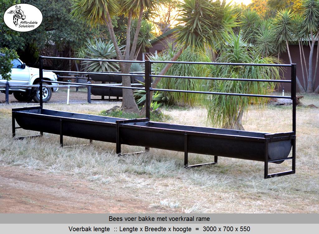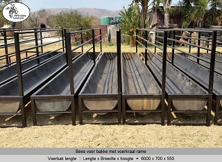 Bees voer bakke met rame vir voer krale gebou in lengtes van 2,4 meter - 3 meter - 4 meter en 6 meter lank. Die voer bakke se hoogte is 550 en die breedte is 700. Die rame is 1 meter hoog bo die voerbak en die opening waardeur die beeste eet is 500mm hoog.
