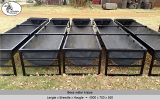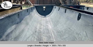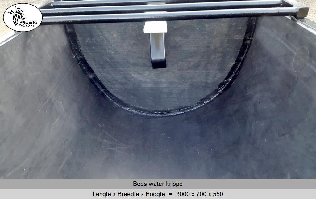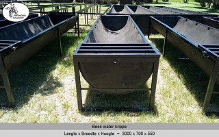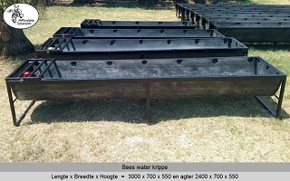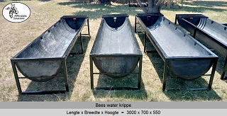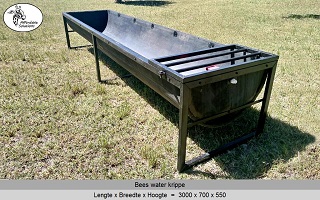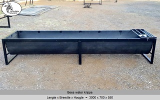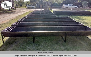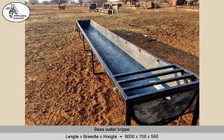 Bees water krippe is 550 hoog en 700 breed. Kalf water krippe is 400 hoog en 500 breed. Water krippe is beskikbaar in lengtes van 2,4 meter - 3 meter - 4 meter - 6 meter.
