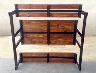 Sterk staal raam, en 110x38 hout planke wat met twee lae olie geverf word.