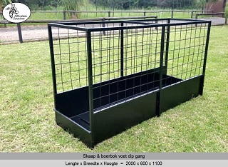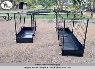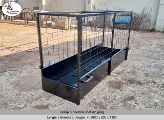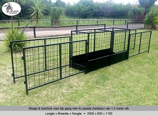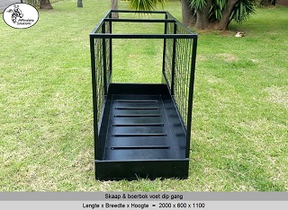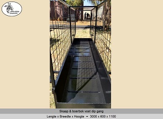 Die voet dip gange is 600mm breed en 1100mm hoog. Op aanvraag bou ons ook die tonnels 1200mm hoog. Die voet dip bad waardeur die skape en boer bokke loop is 200mm diep.