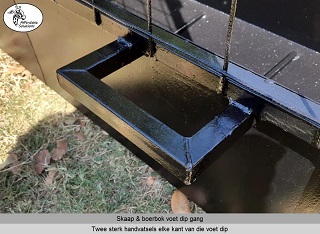 Op die twee punte van die voet dip gang, sweis ons 25x25 square tubes waardeur 'n 10mm - 16mm round bar gedruk kan word om panele aan die voet dip gang te koppel.