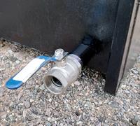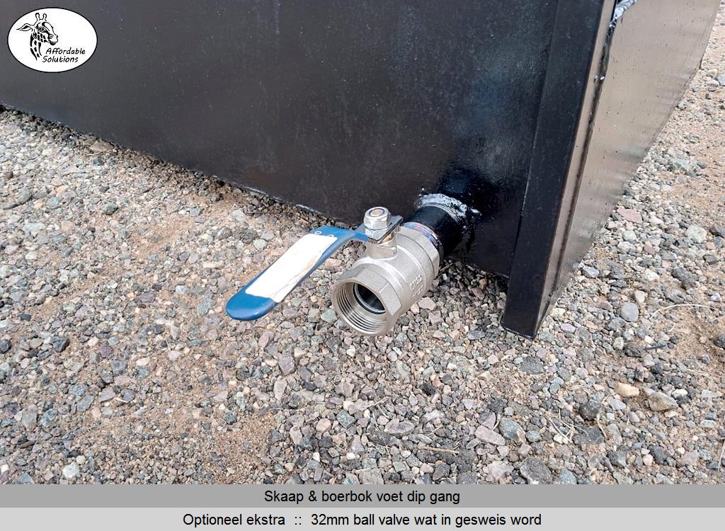 Die voordeel van die ball valve, is dat dit is maklik om die dip-water uit te laat terwyl jy besig is om te dip en die bak word te vol, en nadat jy klaar die skape of boer bokke gedip het. Jy koppel net 'n 32mm pyp aan die ball valve, en kan die dip-water lei tot waar jy dit wil laat uitloop.