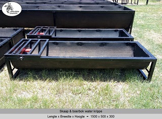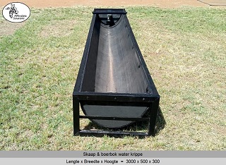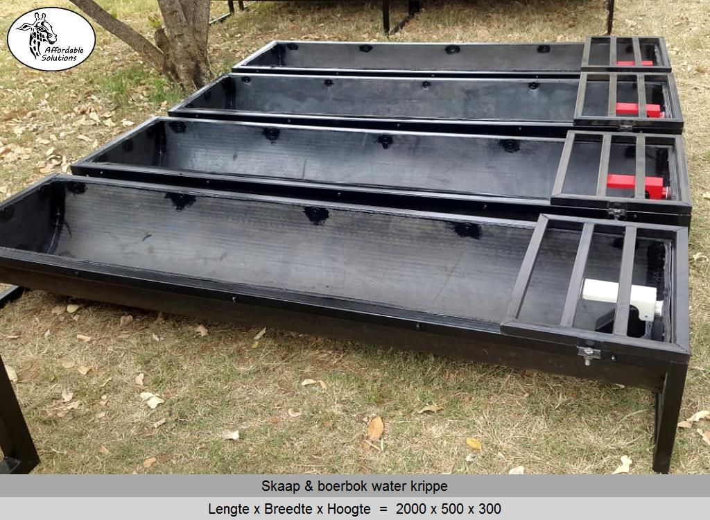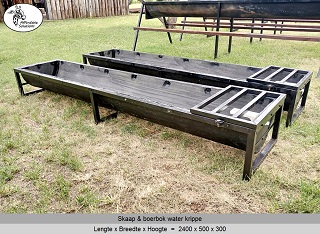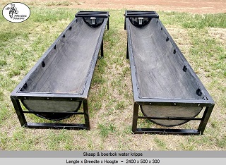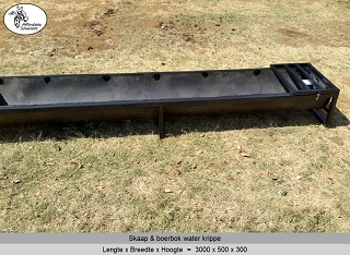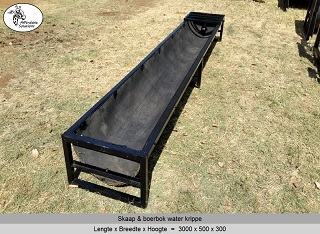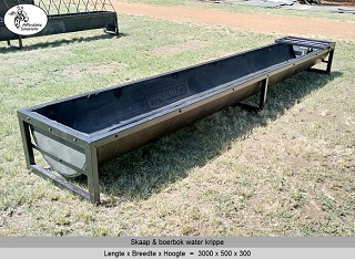 Die water krippe is 50cm breed en 30cm hoog. Beskikbaar in lengtes van: 2,4 meter - 3 meter - 4 meter - 6 meter, of lengte van die boer se keuse.
