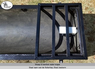 Die skaap en boerbok water krippe is gebou met 'n baie sterk staal raam, wat geverf word met red oxide en swart industriële verf. Net soos met alle produkte wat ons bou, word alle hoeke van die staal raam 45 grade gesny en aan mekaar gesweis. Daar is geen openinge op die staal raam nie.