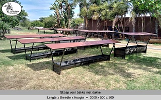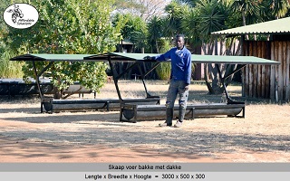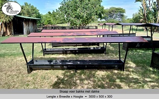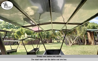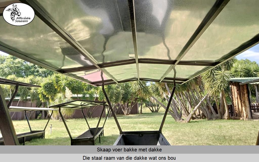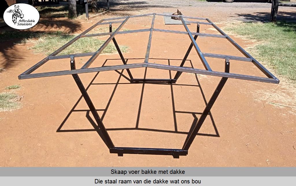 Die dak se bene en staal raam word gebou met 32x32 square tube en 25x25 square tube. Die staal plaat wat op die dak gesit word, is vol versink (fully galvanized). Die dak kan baie maklik van die voerbak afgehaal word, deur 8x 10mm boute los te draai.