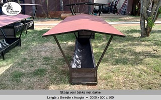 Die dak se bene en staal raam word gebou met 32x32 square tube en 25x25 square tube. Die staal plaat wat op die dak is, is vol versink (fully galvanized). Die dak kan baie maklik van die voerbak afgehaal word, deur 8x 10mm boute los te draai.
