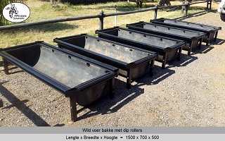 Voer bakke met dip rollers is beskikbaar in lengtes van 1.5 meter, 2 meter, 2.5 meter en 3 meter lank.