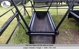 Die houers waarin die dip gegooi word - en die rollers is: 700mm breed voer bakke het 8cm breed en 4cm diep dip houers, met 50mm staal pyp rollers. 500mm breed voer bakke het 8cm breed en 4cm diep dip houers, met 50mm staal pyp rollers. Die staal rollers kan uitgehaal word om die dip houers skoon te maak.